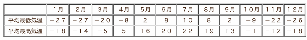 ちなみに、気温はこんな感じらしい。やっぱ寒いけど、意外と夏は気温上がるんだな。