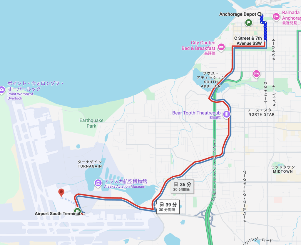 アンカレッジの駅から空港は車で 15 分くらい、公共交通機関だと 40 分くらいっぽい。