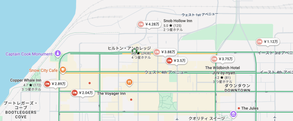 アンカレッジの駅の周辺にホテルはあるっぽい。