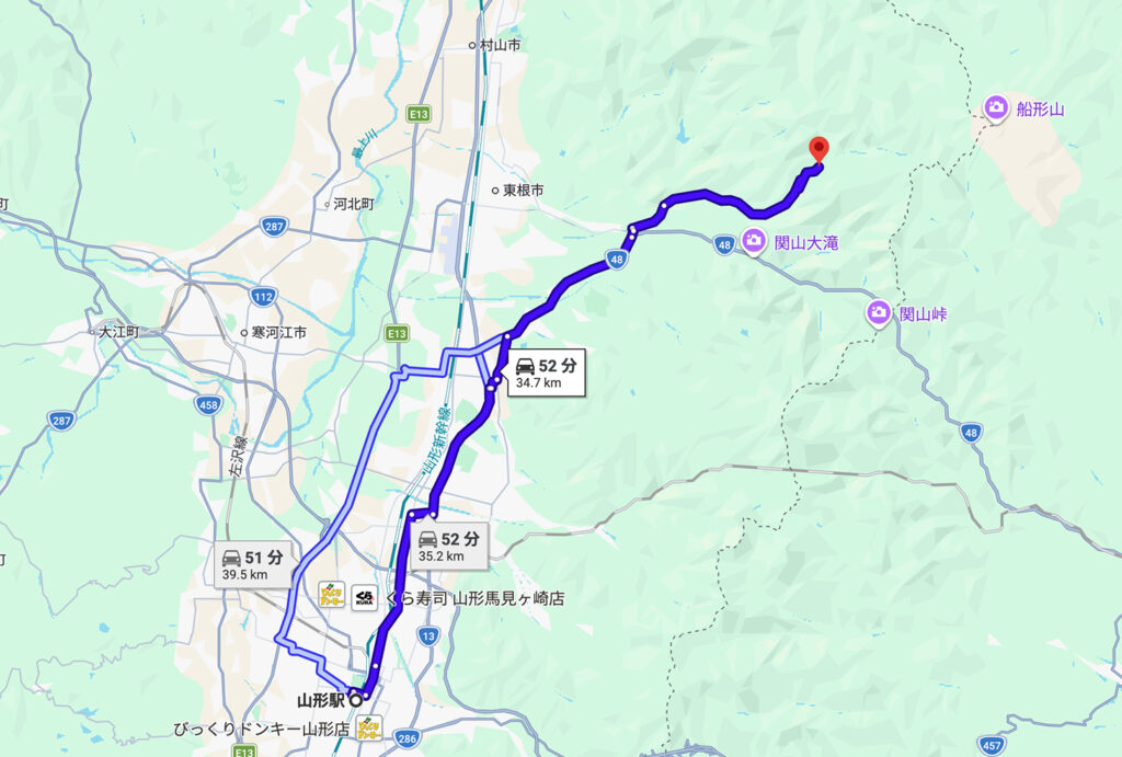 山形駅からだと 30Km くらいですが、平日のため通勤渋滞にハマり 1 時間ちょっとかかったかな。